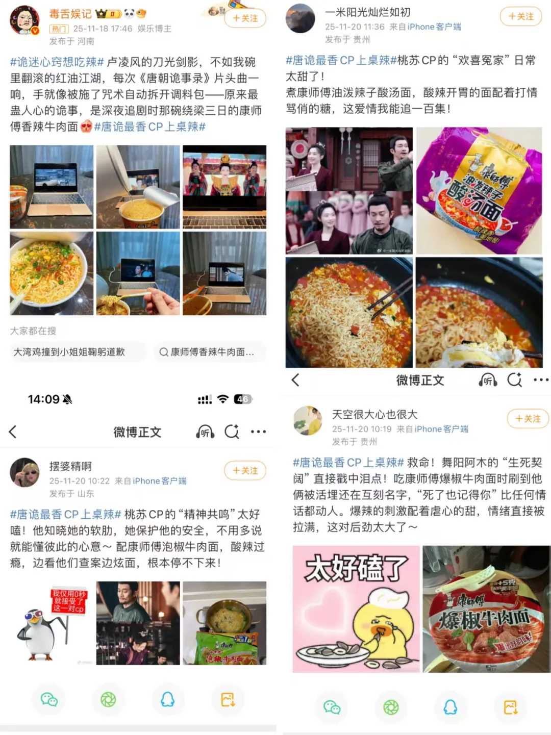 方便面本就是追剧场景下观众的优选之一,康师傅此次与唐诡联动后,辣味本身的情绪价值与追剧的愉悦满足交织,带给观众更多满足。不少观众将康师傅辣口味系列视为追剧标配,称辣味能“驱散悬疑紧张感”,与剧中探案的“热血上头”形成共鸣。