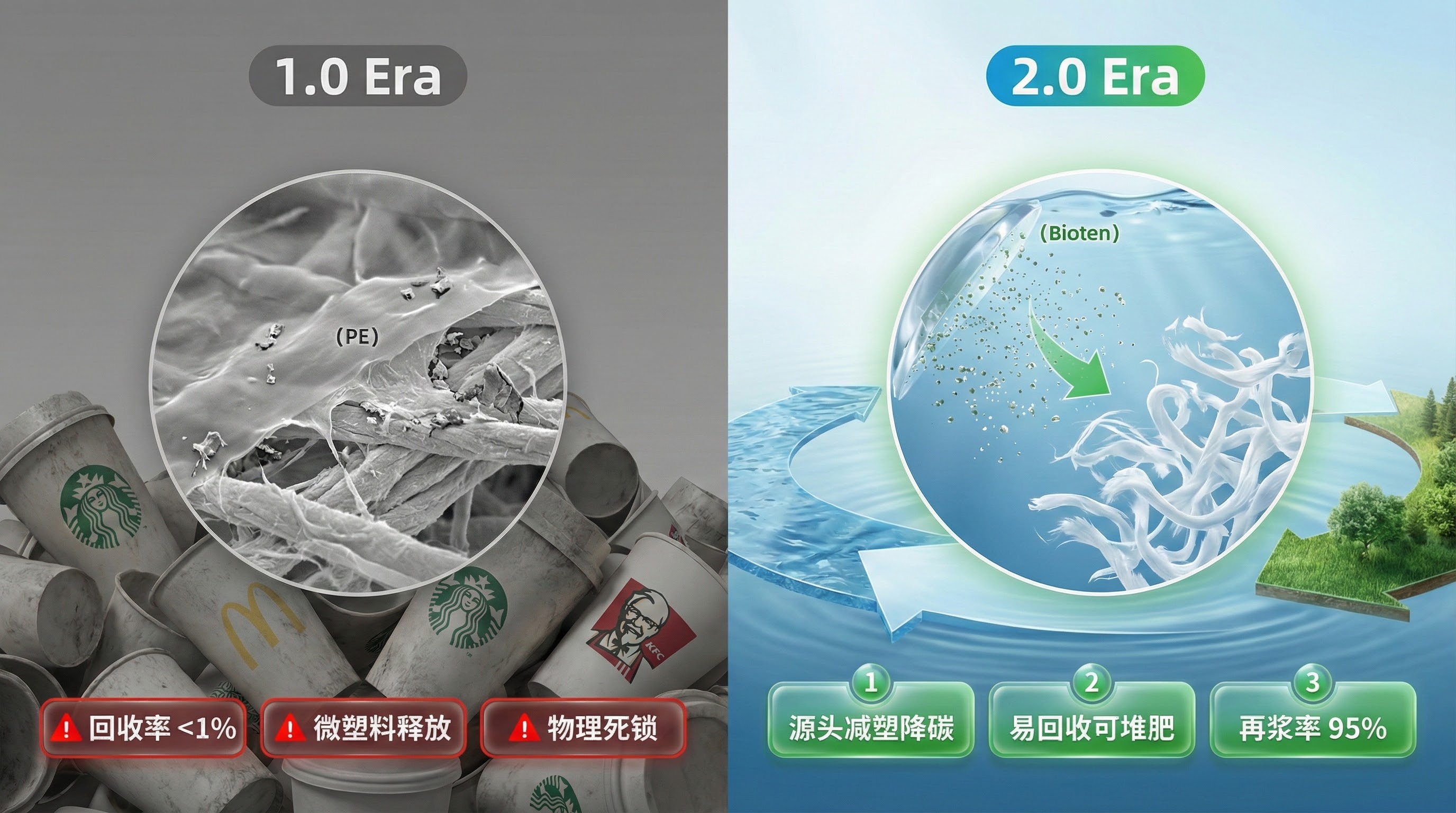 过去十年,在“禁塑令”驱动下,行业曾尝试多种替代方案,但长期受困于“难回收”与“难堆肥”的双重困局。行业数据显示,全球每年消耗的一次性纸杯约3200亿个。传统“纸+PE淋膜”结构因物理覆膜死锁,导致回收利用的成本远远大于使用新的纸浆纤维,实际回收率不足1%。而另一部分欧美法规倡导多年的宣称“可堆肥、可降解”的包装,实际受限于全球城市工业堆肥设施的匮乏与高昂堆肥成本,最终绝大多数依然流向了焚烧厂或填埋场,沦为“伪堆肥”现实难题。