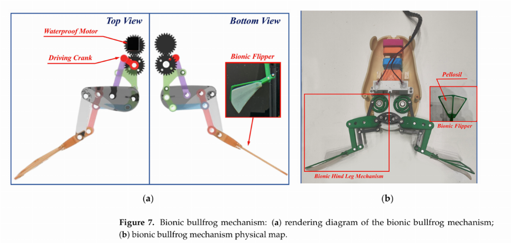 研究以牛蛙后肢运动机制为仿生原型,提出并实现了一种水下仿生机器人推进系统设计方案。该系统采用三阶段四连杆机构模拟牛蛙“踢腿—恢复”运动,通过单电机驱动实现周期性推进。