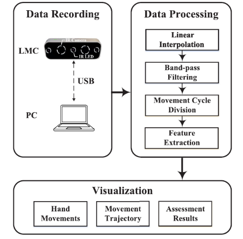 该量化评估系统采用 Leap Motion Controller(LMC)光学传感器,其优势在于体积小巧,可在不接触患者的情况下获取手部运动数据。