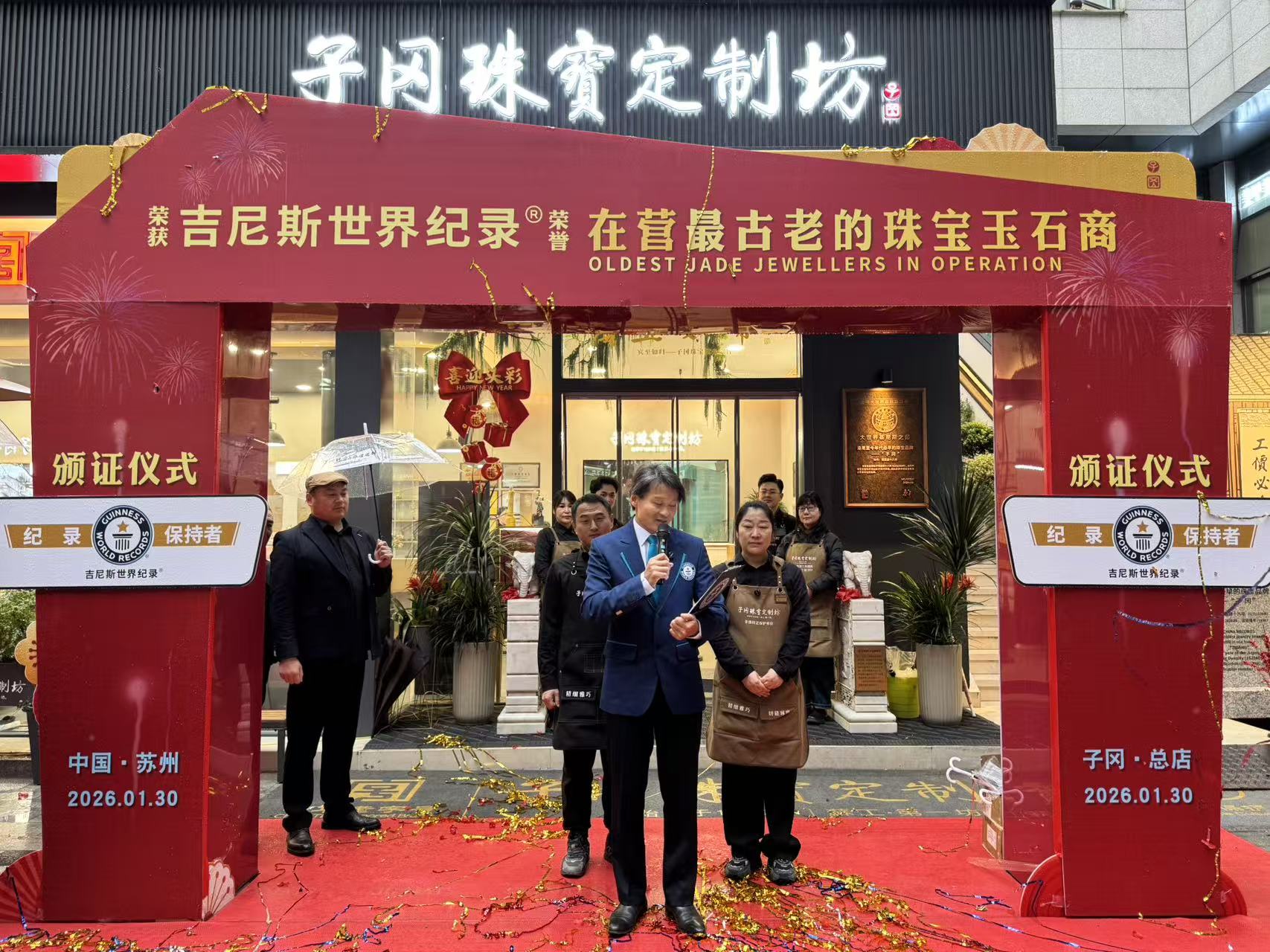 1月30日下午,在子冈苏州总店举行的颁证仪式上,吉尼斯世界纪录官方认证官亲自将认证证书授予子冈珠宝司马行、成娟等优秀员工代表。100名子冈员工共同见证了这一历史时刻,标志着品牌487年传承的传奇故事获得国际认可。吉尼斯世界纪录的认证不仅体现了子冈珠宝在行业中的历史地位,更彰显了其作为“文化活化石”的独特价值。这一认证是对子冈珠宝历代匠人不懈努力的肯定——他们坚守“守正创新”的理念,使品牌得以在历史长河中屹立不倒,成为传统与现代交融的典范。子冈珠宝成为当之无愧的苏工第一坊。