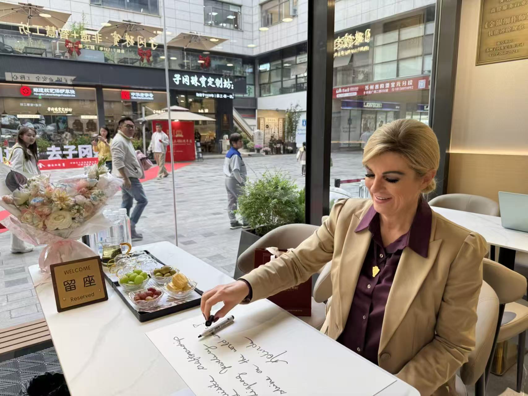 2025年,子冈苏州总店接待了多位外宾顾客。在中国情人节七夕节期间,格鲁吉亚前总统乔治·马尔格韦拉什维利和夫人专程到访子冈,定制首饰;子冈非遗+智慧工坊试营业期间,国际奥委会委员、克罗地亚前总统科琳达女士在子冈定制首饰后,还为品牌在留言簿上写下:“愿子冈珠宝的东方匠心早日闪耀世界舞台。”