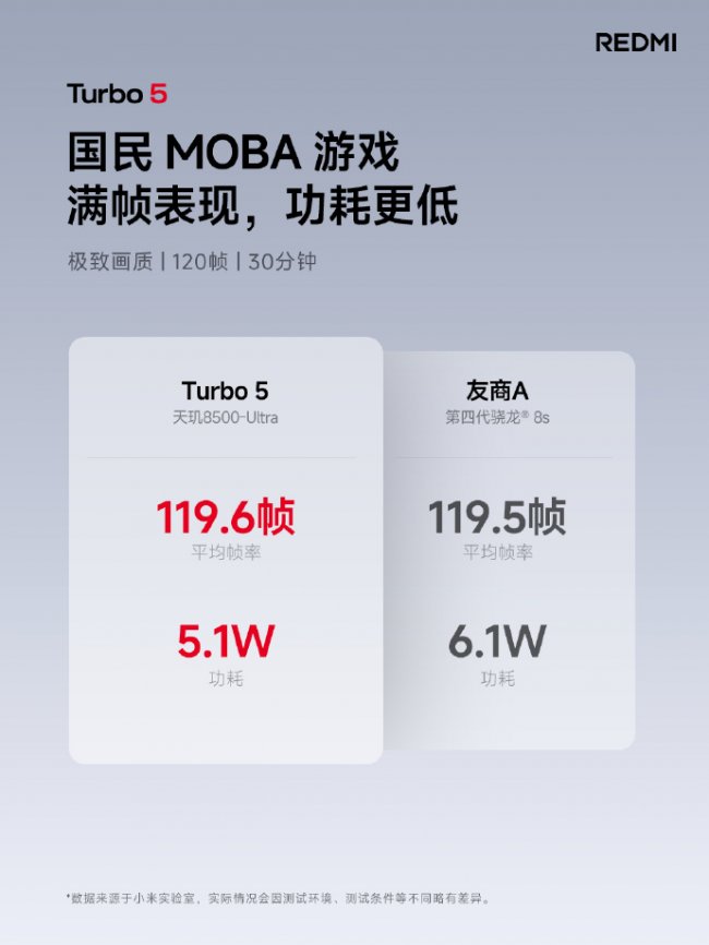 同时,搭载天玑8500的Turbo 5也在发布会上正式亮相,天玑8系的神U体验还在持续更迭,实测在国民MOBA游戏中,REDMI Turbo 5在30分钟120帧满帧跑的同时,功耗比友商更低,这款手机必将给年轻的玩家们带来更多惊喜。