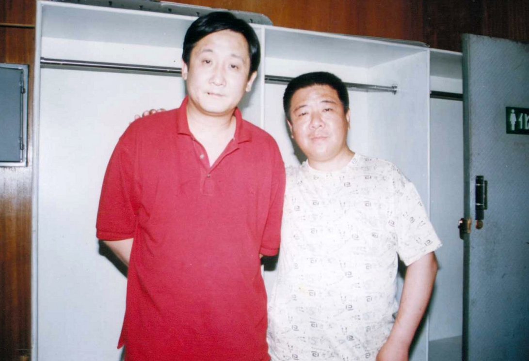 图片说明:2003年何忠利创办四季清真卤味店,很多社会名流纷纷前来庆贺,图为何忠利相声演员李国盛合影。