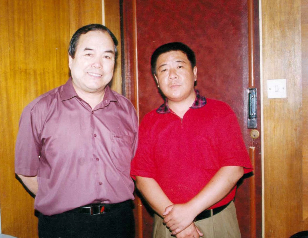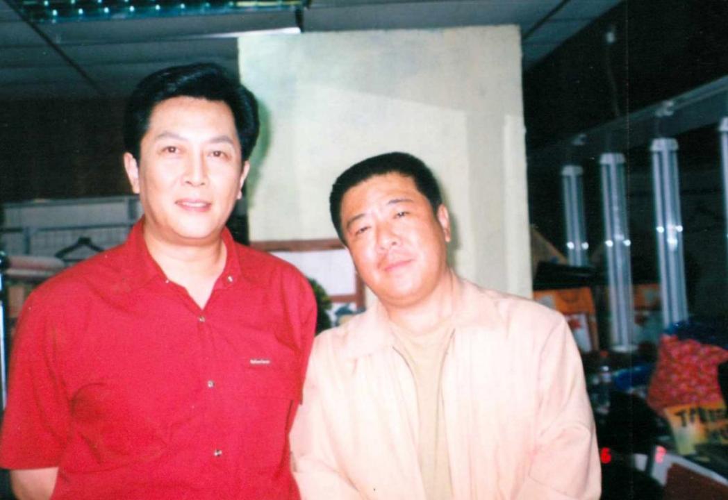 图片说明:2003年何忠利创办四季清真卤味店,很多社会名流纷纷前来庆贺,图为何忠利演员唐国强合影。
