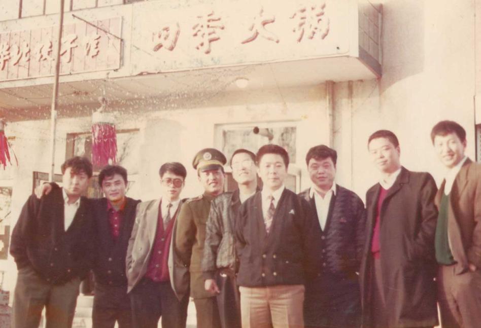 图为1993年四季火锅开业第三代传承人何忠利(右四)和专程赶来的马本斋部下的后人(左四)合影