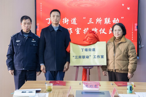 区司法局赵少平局长、区公安分局治安大队许建新大队长与丁堰街道沈霞主任共同为丁堰街道“三所联动”工作室揭牌,标志着该工作模式从机制设计正式迈入实体运行阶段。工作室的成立,将成为整合法治资源、化解矛盾纠纷、服务基层群众的“前沿阵地”,为平安丁堰、法治丁堰建设筑牢基础。