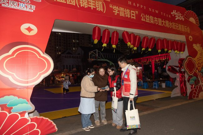 在装扮一新的大南水街举办的“学雷锋”日公益集市上,沙洲社区志愿服务队的志愿者们身穿红马甲,热情地向居民发放宣传资料,耐心讲解政策法规、反诈知识、健康常识等,将便民服务与节日欢乐融为一体,吸引了众多居民参与互动,成为春日街头一道亮丽的风景线。