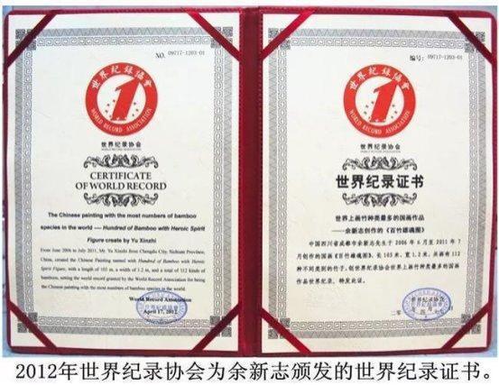 2011 年 6 月,国画大师余新志老师历时 5 年完成了一幅幅长 100 米,宽 1.2 米的百竹长卷 ,用高超的表现手法画了 112 种不同类别的竹子 ,创下了世界上画竹种类最多 ,最壮美的国画作品创世界记录。《百竹雄魂图》——“万竿竹魂铸春秋” ,2012 年 4 月被世界纪录协会向余新志先生颁发了创世界纪录证书。