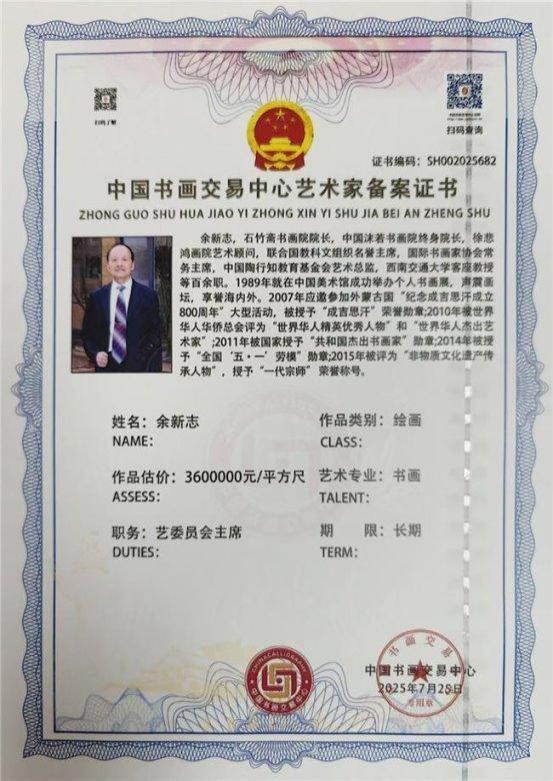 学者、杰出书画大家余新志先生 , 1941年生于四川乐山 ,定居北京。成吉思汗黄金家族后裔。现为国家一级美术师、教授,联合国教科文组织名誉主席 ,国际书画家协会常务主席 ,中国香港文联副主席 ,中国沫若书画院终身院长,徐悲鸿画院艺术顾问 ,中国陶行知教育基金会艺术总监 ,西南交通大学客座教授等百余职。 1989 年就在中国美术馆成功举办个人书画展,声震画坛,享誉海内外。2007 年应邀参加外蒙古国“纪念成吉思汗成立 800 周年”大型活动,被授予“成吉思汗”荣誉勋章:2010 年被世界华人华侨总会评为“世界华人精英优秀人物”和“世界华人杰出艺术家”;2011 年被国家授予“共和国杰出书画家勋章:2015年被评为“非物质文化遗产传承人物” ,并授子“一代宗师”荣誉称号。 2017 年在美国洛杉矶举办画展 ,受邀走进联合国会议大厅参加高峰论坛会受到布鲁斯·罗茨主席的亲切接见并合影留念。 2021年 ,建党 100 周年之际 ,余新志、张大千、林散之、李苦禅、林凤眠、