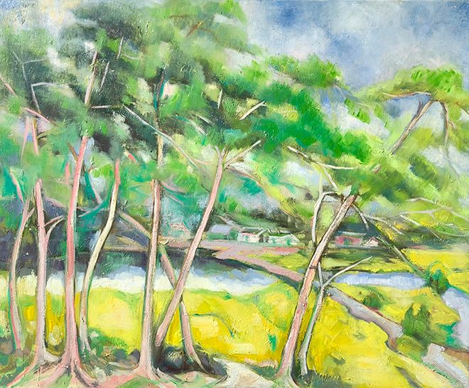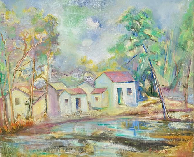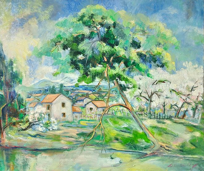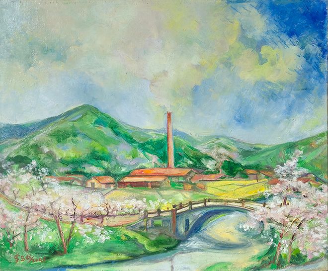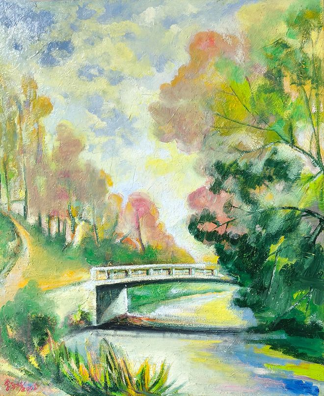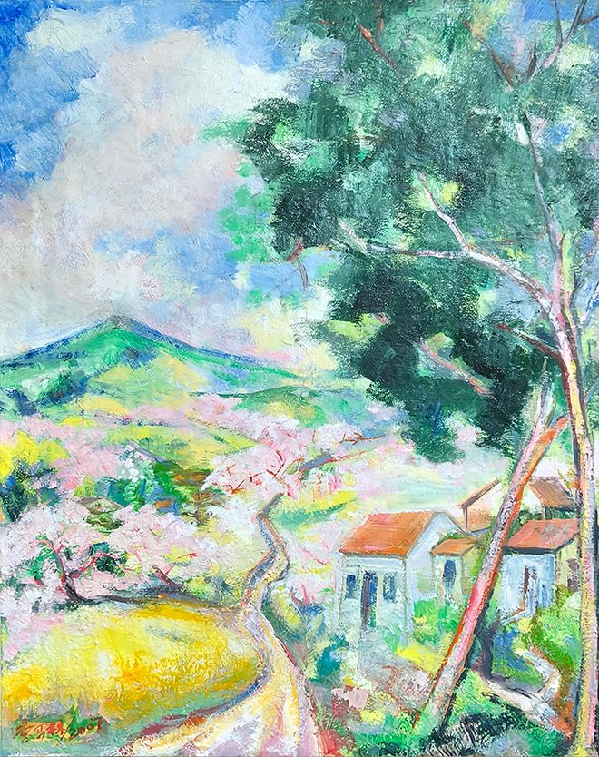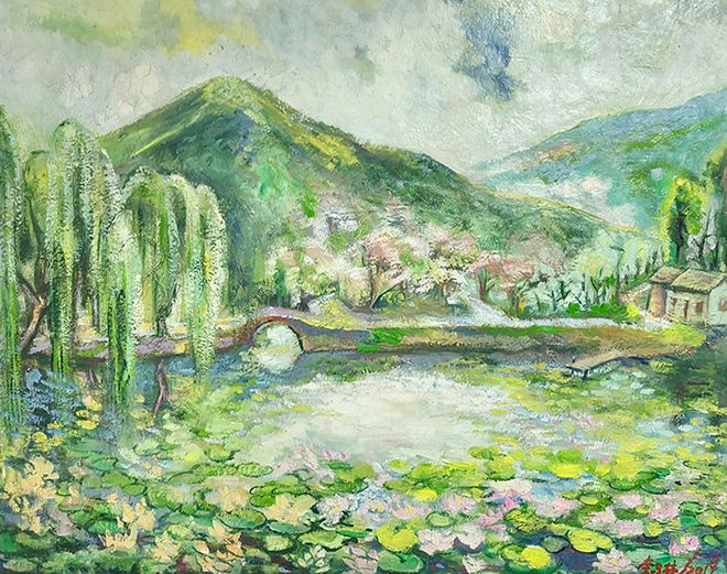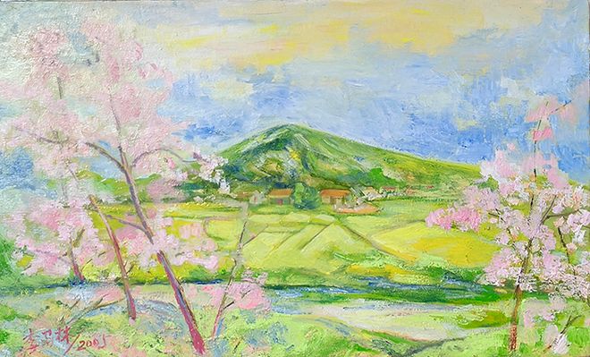 他对色彩的“高敏感度区分”(如花瓣的粉白渐变、山峦的冷暖色层),将水彩“明净、灵动”的特质融入油画创作。画面中无“浊污之色”,色彩层次细腻如丝,既保留了油画的“厚重质感”,又兼具水彩的“通透生机”——这种“跨媒介技法融合”,拓展了油画的表现力边界,为现代绘画的“技法杂交”提供了实践案例。