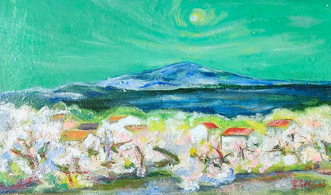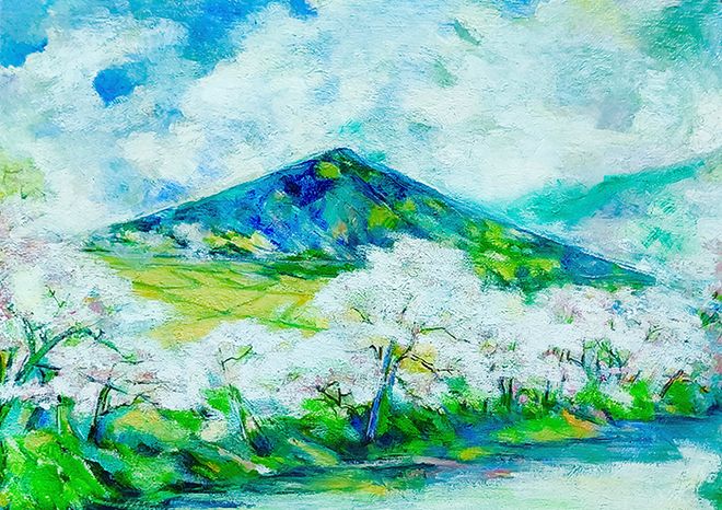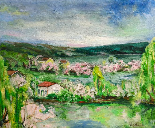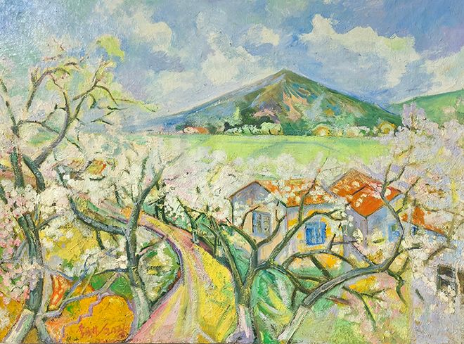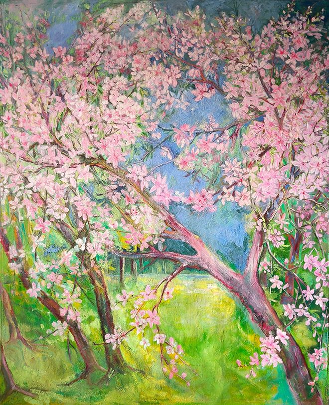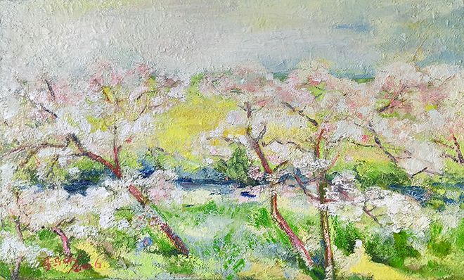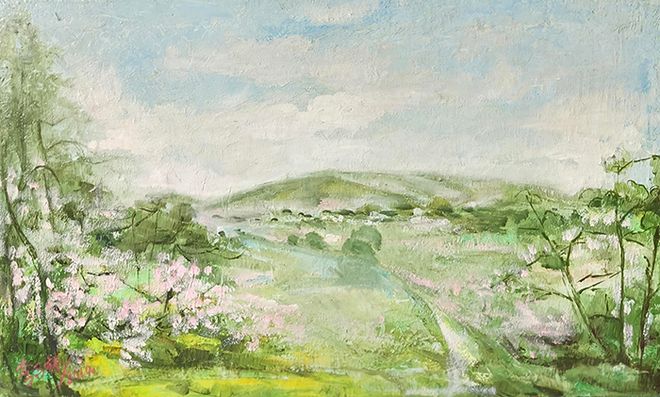 :画面从“近花”到“远山”的空间层次(粉白繁花→黄绿田野→青绿山峦→灰白云朵),构建出“从细腻生机到宏大静谧”的诗意纵深感。观者仿佛“步入春日山谷”,获得心灵疗愈——这种“审美共鸣”的营造,证明现代绘画可超越“形式实验”,回归“精神疗愈”的本质,为“艺术疗愈”“美学减压”等当代议题提供了视觉方案。