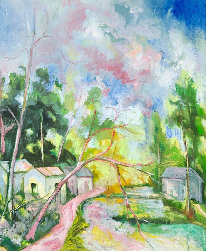 画面中山峦的“空灵雄浑”、繁花的“诗意朦胧”,借鉴了中国山水画“留白、气韵”的审美逻辑(如传统山水“远山含黛、近花含情”的意境),但通过油画的厚涂肌理、色彩并置实现(如云朵的蓬松感以油彩堆叠,繁花的柔美以粉白与青绿的色彩对比烘托)。这种“以油画写水墨意”的方式,打破了“油画写实、水墨写意”的媒介偏见,证明油画也能承载东方哲学的“空灵、含蓄”。
