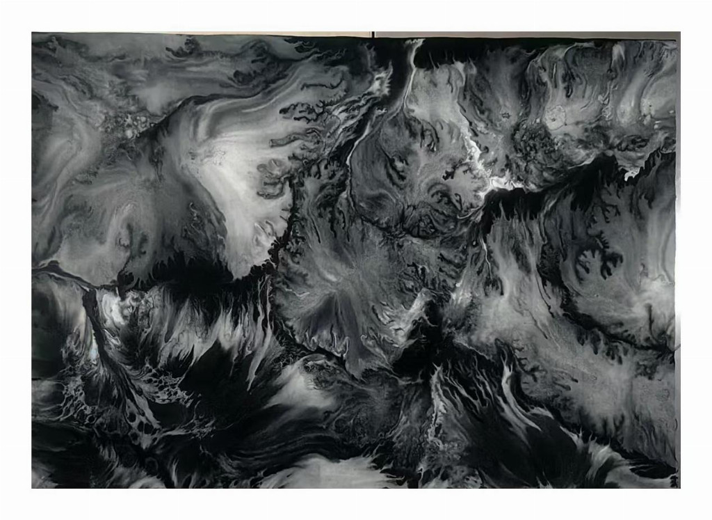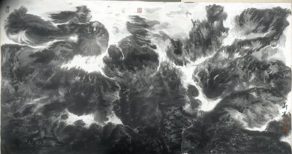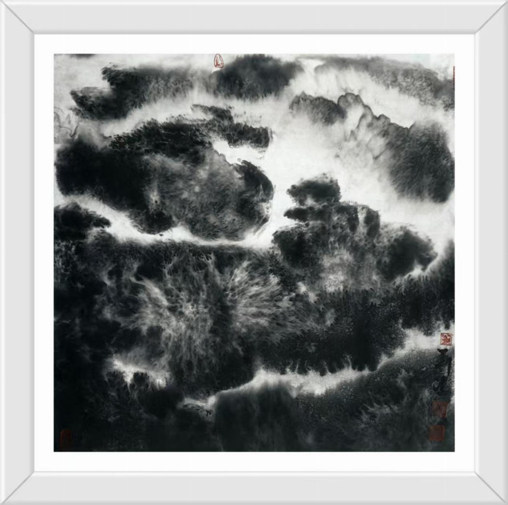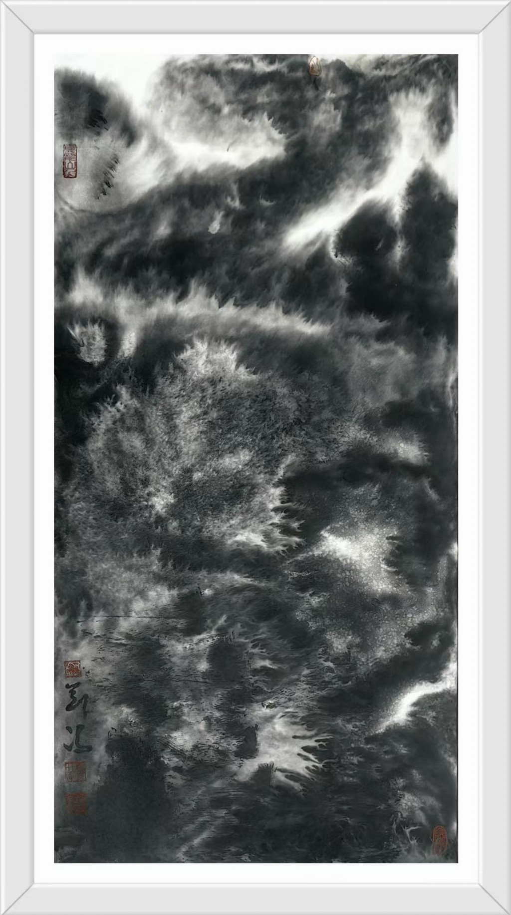 宏观刘冯先生之作,画中山水从不施以彩色,更不媚以矫饰,而是独以水墨气象挥毫妙意,笔墨浸染,山水一体,浓墨之处可见万壑松云之浩然,淡墨之处则又可见云水飘荡之幽谧!臂如画中飞瀑,乃依山势而奔腾弥漫,皴擦其质感,点染其动态,是谓粗狂中不失严谨,淋漓中不失真意,欣赏之余,似有水雾扑面而来!而如此激荡自然的水韵气象,也恰恰就是能从侧面充分反映出刘冯先生对于水墨的高度写意掌控,刹那之间,可感旷达,细品之余,更见畅神!