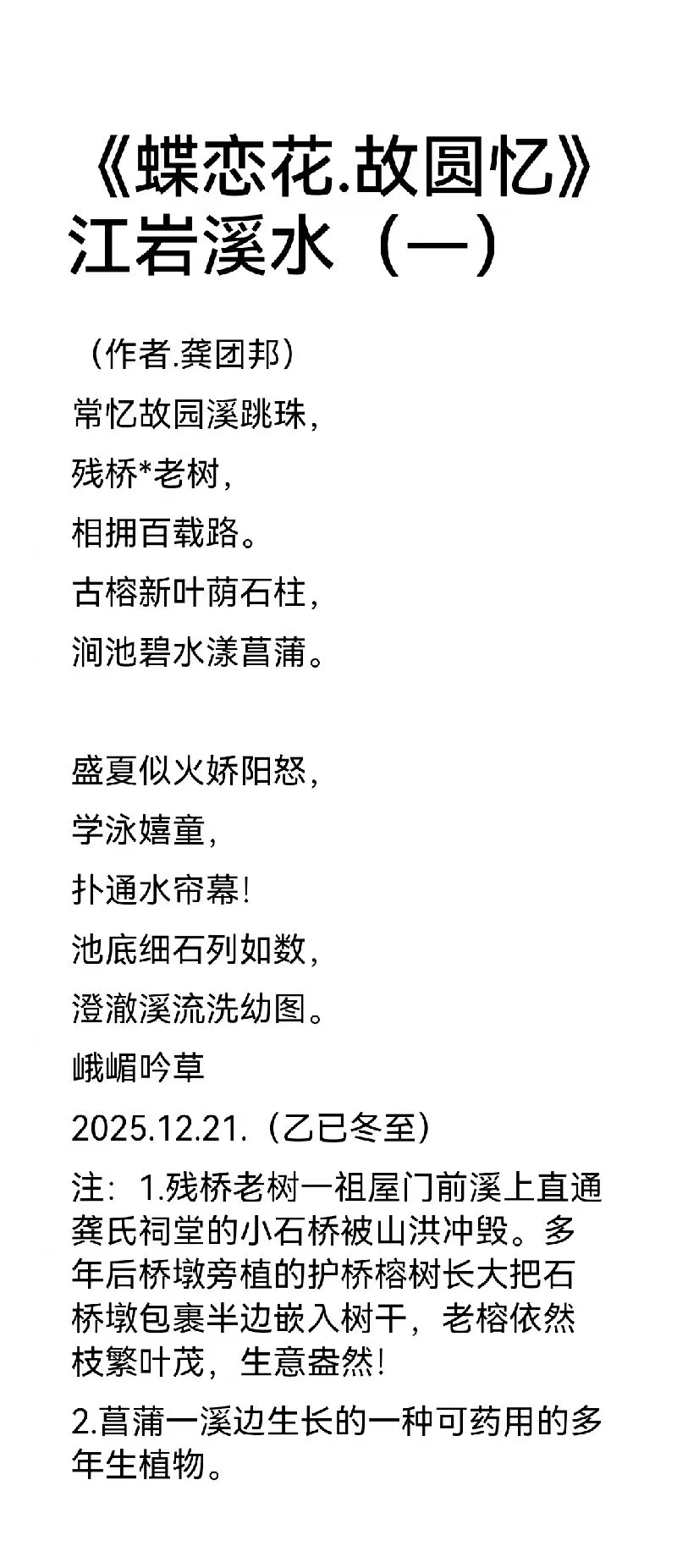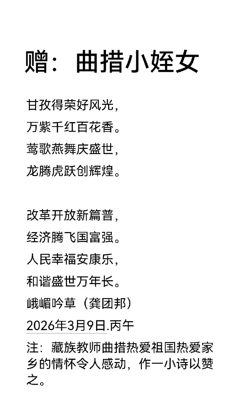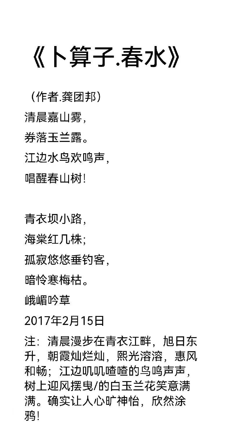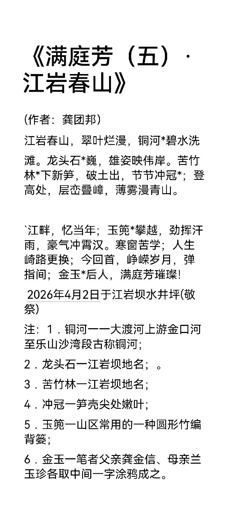 龚团邦,男,汉族,字楊铭,号《嘉玉阁》主人,中共党员,大专文化;一九五二年出生于四川省乐山县沙湾区老鸦乡,启蒙于乐山沙湾郭老(郭沫若)故乡一沙湾小学,受郭老影响较大,爱好文学和中国古典诗词的学习与创作。笔名汉邦,楊铭,桓邦,怪老头,峨嵋吟草,乐山乐水,嘉山樵夫,凌云山人。