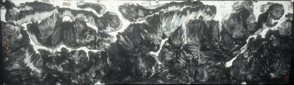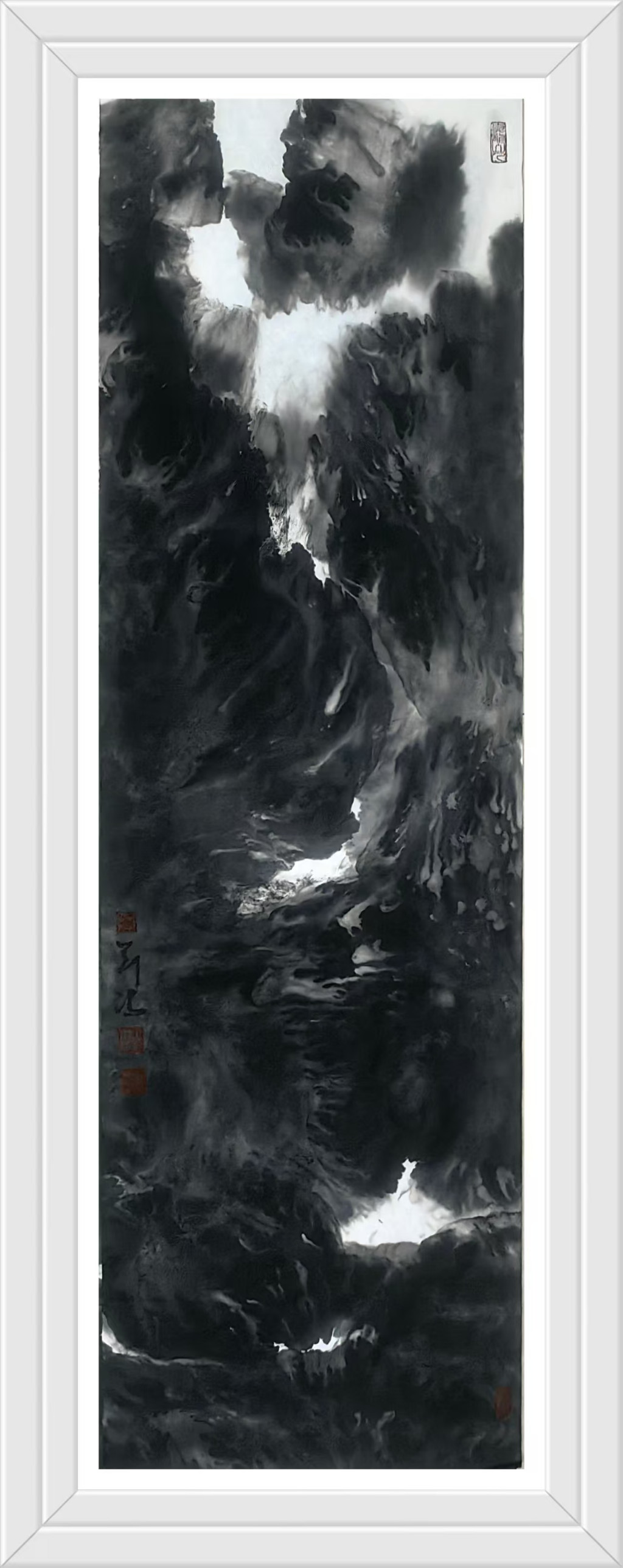 宏观刘冯先生之作,画中山水从不施以彩色,更不媚以矫饰,而是独以水墨气象挥毫妙意,笔墨浸染,山水一体,浓墨之处可见万壑松云之浩然,淡墨之处则又可见云水飘荡之幽谧!臂如画中飞瀑,乃依山势而奔腾弥漫,皴擦其质感,点染其动态,是谓粗狂中不失严谨,淋漓中不失真意,欣赏之余,似有水雾扑面而来!而如此激荡自然的水韵气象,也恰恰就是能从侧面充分反映出刘冯先生对于水墨的高度写意掌控,刹那之间,可感旷达,细品之余,更见畅神!