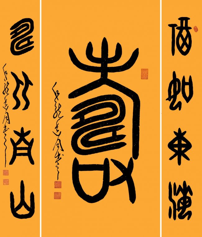 中堂:金文:寿,甲骨文对联:福如东海,寿比南山。(4尺整张+4尺3开x2)