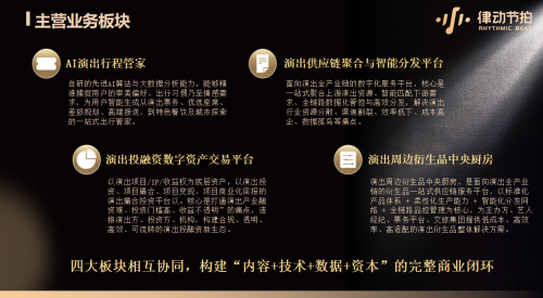 四大主营业务相互协同,让律动节拍实现了从单一票务服务到全产业链赋能的跨越。AI演出行程管家是前台的用户入口,演出供应链平台是后台的资源中枢,投融资数字资产平台是资本引擎,衍生品中央厨房是价值放大器——四者共同构成“内容+技术+数据+资本”的完整商业闭环。