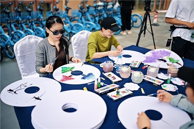 图:现场参与车轮片涂鸦活动的市民动手绘画车轮片