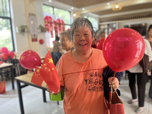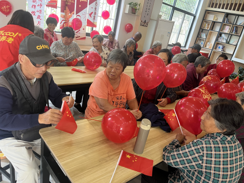 “大伙别着急,先把红卡纸放平整了,五角星贴纸对着虚线贴,贴歪了也没事儿,我来帮您调!”在制作国旗的环节,志愿者们一边将红卡纸、五角星贴纸、小刷子和胶水等材料分发到老人手中,一边耐心地讲解着步骤。82岁的李奶奶眼神不太利索,拿着星星贴纸迟迟找不准位置。志愿者见状,立刻蹲下身来,凑近她耳边轻声说:“奶奶,我帮您扶着这儿,您慢慢贴,不着急。”69岁的张爷爷手指不太灵活,捏不稳贴纸,工作人员便轻轻托住他的手,一起将金色的五星稳稳地贴在红色卡纸上。老人们都做得格外认真,有的眯着眼睛仔细比对位置,有的用手心小心翼翼地把贴纸抚平。当一面面亲手制作的小红旗完成时,大家都忍不住举起来互相展示,脸上洋溢着藏不住的自豪。那一面面红旗,红得鲜亮,也仿佛把老人们这份深沉的心意,暖暖地裹在了其中。