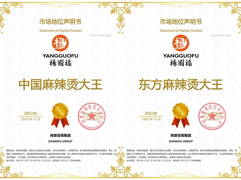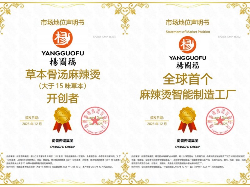 在对全球范围、全渠道市场的系统调研与数据分析之后,权威市场研究机构尚普咨询集团正式向杨国福集团颁发了四项重量级市场地位认证:“杨国福,东方麻辣烫大王”、“杨国福,中国麻辣烫大王”、“杨国福,草本骨汤麻辣烫(大于15味草本)开创者”以及“杨国福,全球首个麻辣烫智能制造工厂”。