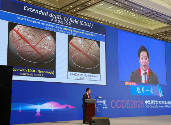 在主会场专题会中,日本神奈川县立癌症中心塩月一生教授以题为《Beyond the Standard-Sharpening Your Clinical View超范立新-锐启临床新见》的报告中,首先介绍了CV-1500主机的性能以及其观察性和操作便捷性提升所带来的临床优势,他指出系统配置包括显示器、主机、台车等,通过组合设计旨在最大化提升内窥镜系统的临床性能,进一步提高稳定性与操控性。GIF-EZ1500-C采用双焦距设计,一键实现100倍光学放大效果,同时搭载了扩展景深技术(EDOF),可将近景对焦与远景对焦的图像相结合,实时生成具有广域景深的图像。在100倍光学放大模式下,景深宽度从1.5mm提升至4mm,扩大景深,放大观察时对焦更容易,使得原本较难掌握的放大观察手技变得轻松,这对临床上普及放大观察手技,提高上消化道早癌检出率有着重要的意义。塩月教授通过将传统内镜放大模式与拥有EDOF的内镜Near模式进行视频动态对比,可以观察到拥有EDOF技术的内镜更易对焦,同时可缩短检查时间,减轻压力。 另外,得益于高像素CMOS传感器与NR(降噪)算法的结合,实现了低噪点HQ画质,提供更清晰的观察影像。此外,该内镜手柄进行了轻量化设计,在提高操控手感的同时,减轻了医生长时间使用时的疲劳感。最后,塩月教授通过浅表性食管癌和早期胃癌实际操作病例视频对产品的临床有用性做了深入介绍。他总结到,GIF-EZ1500-C与CV-1500结合使用让图像更清晰,一键放大操作更便捷,可以更好的实现操作性和通用性的放大观察。