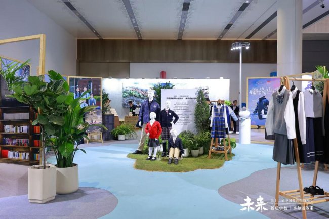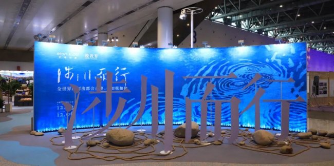 会场一隅,伊顿纪德品牌艺术展“涉川而行·全世界的河流都会重逢,一如我和你”以河流、岛链、涟漪为核心意象,串联起“一滴水的澄澈与明亮”“一方池塘的共生共茂”“所谓伊人,在水一方”“打开明亮的日常”四段旅程,以“文以载道”与“衣以载道”为线索,以行动致敬美好教育。
